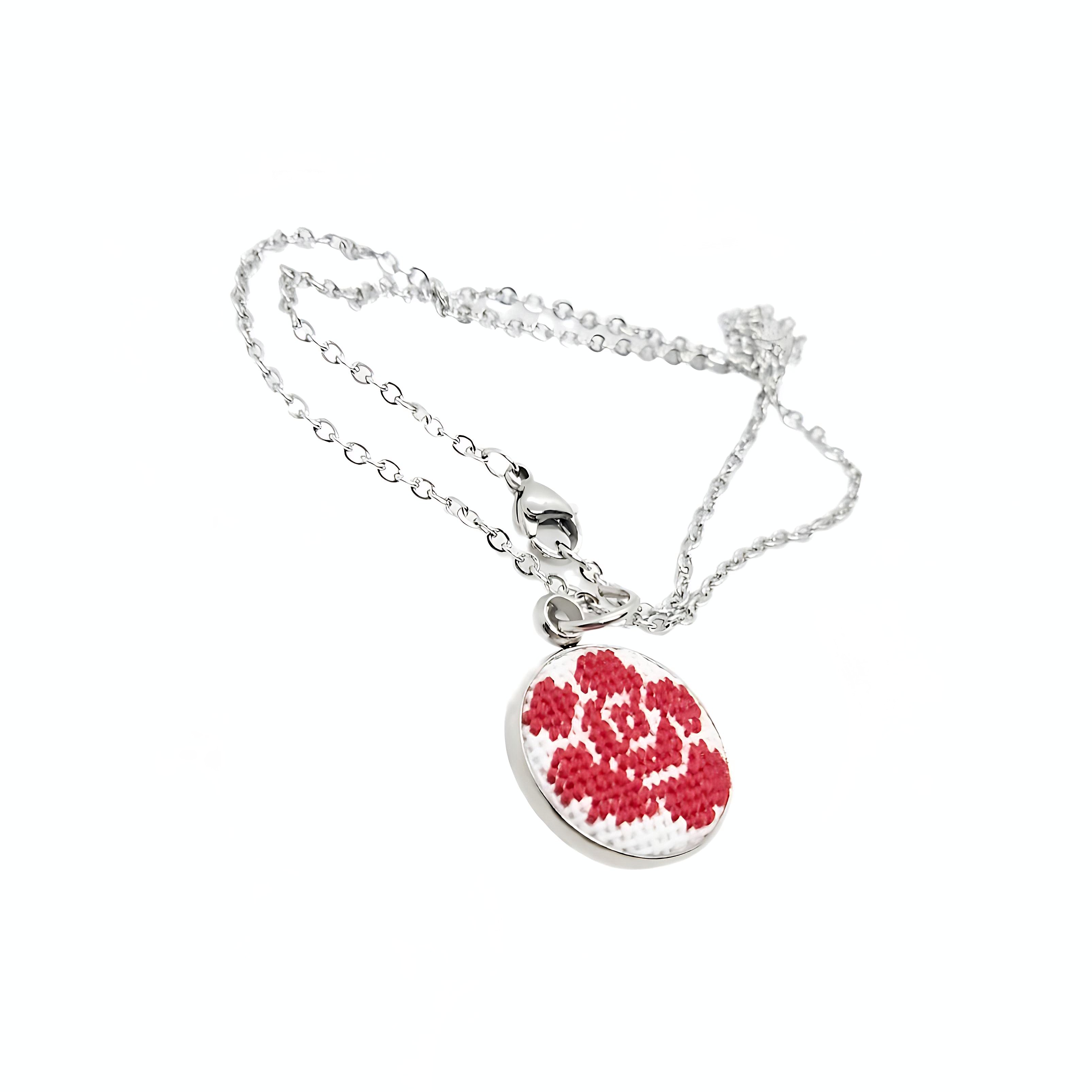 Combintia dintre inox si broderie le face purtabile atat la baza gatului cat si mai lung pe corp, lantul masurand aproximativ 45 cm.