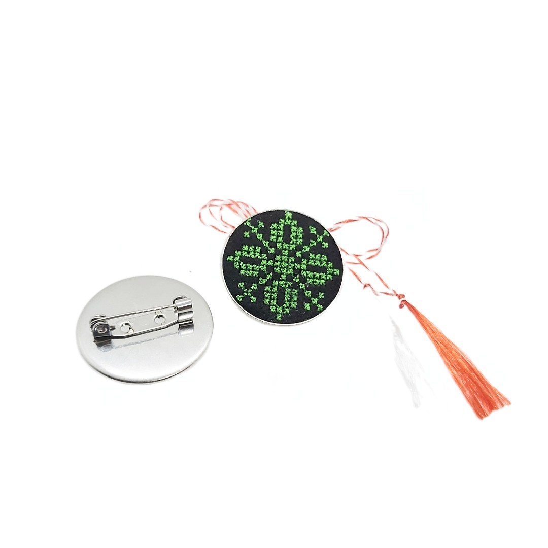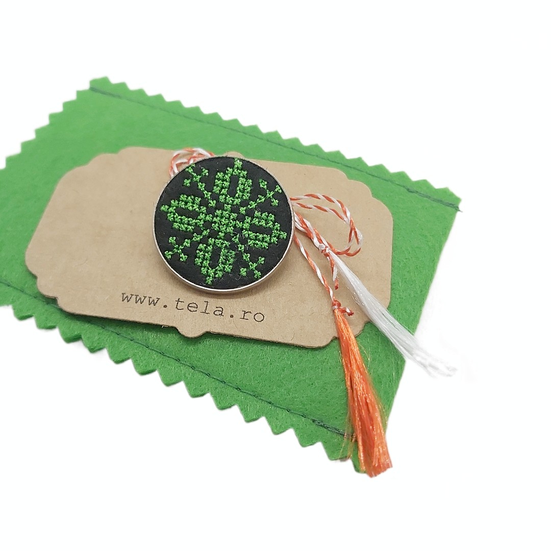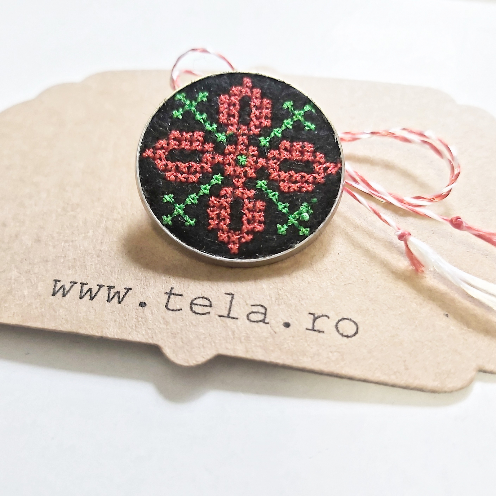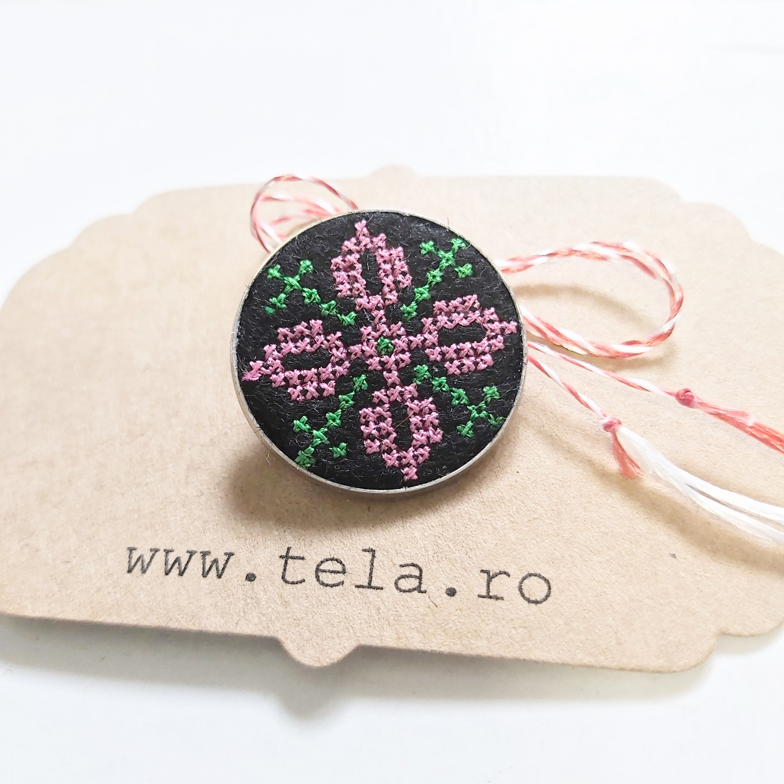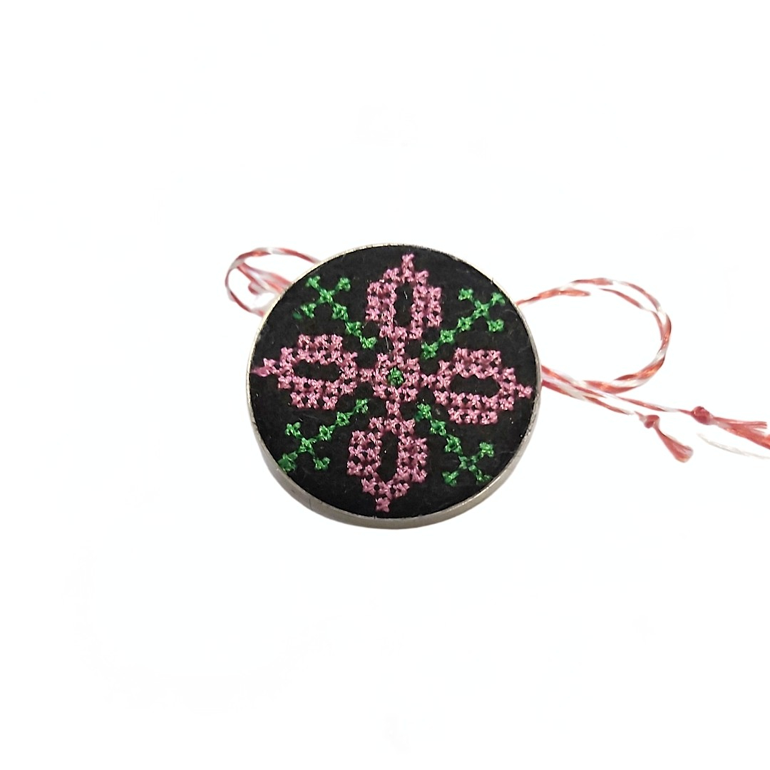 Martisor traditional tip brosa de inox cu broderie etno si model floral